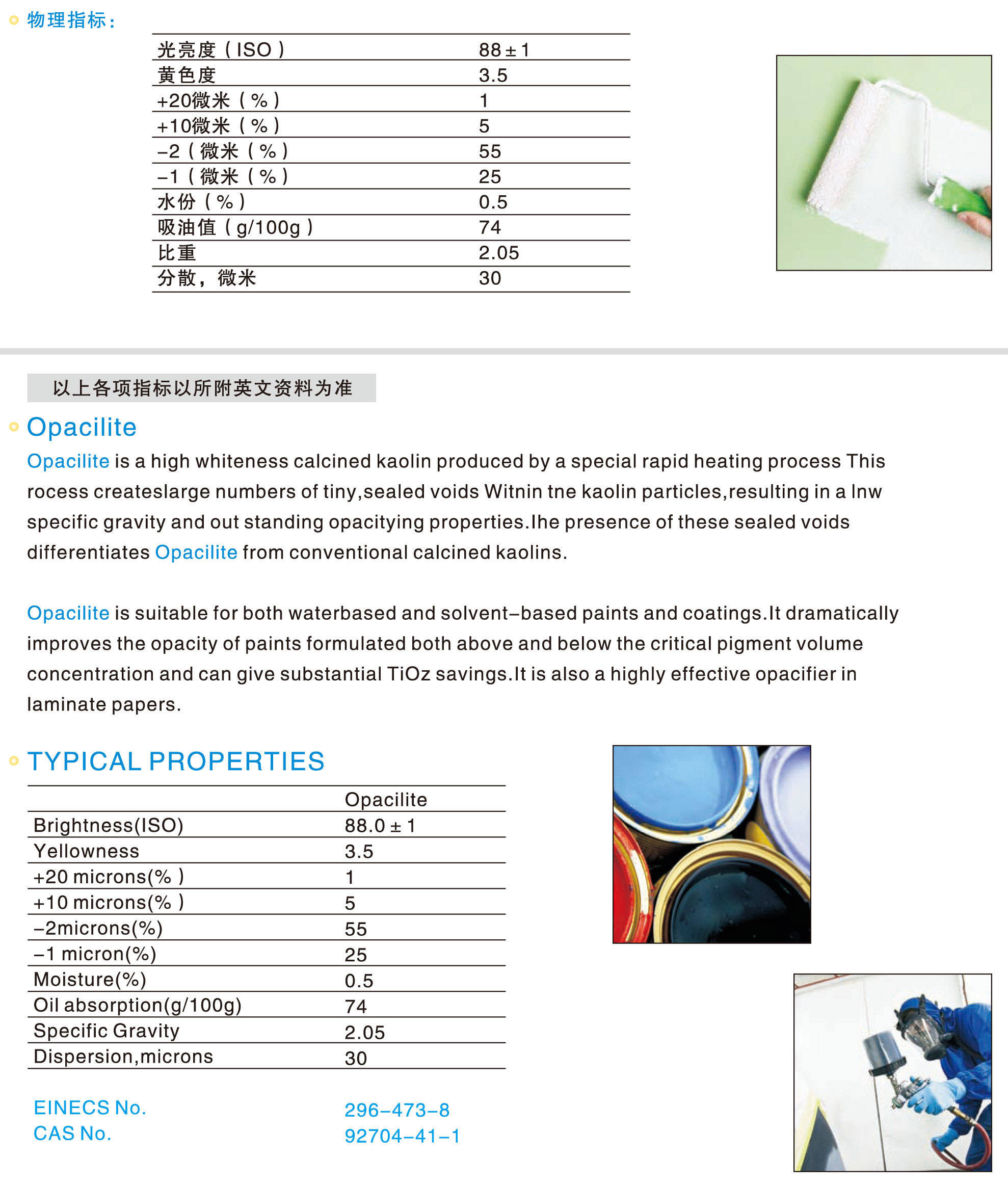 Opacilite是通過一(yi)種快速加(jia)熱工藝生(sheng)産出來的(de)高白度煅(duàn)燒高嶺土(tu)。這種工藝(yi)過程使高(gāo)嶺土顆粒(lì)形成大量(liang)密閉的空(kong)隙,使之具(ju)有低比重(zhòng)和優異遮(zhē)蓋效果的(de)特性,正是(shi)這些🈲密閉(bì)的空隙使(shi)❤️Opacilite不同于其(qi)他的一般(bān)煅燒高嶺(lǐng)土産品。 Opacilite适(shì)用于水性(xìng)和溶劑性(xìng)油漆塗料(liao),無論在高(gāo)于或低于(yu)原料體積(jī)濃度(PVC)的配(pèi)方中都能(néng)🏃🏻♂️十分明顯(xiǎn)地提升油(you)漆塗料的(de)幹濕遮蓋(gài)率,具有很(hen)🌍強的消光(guang)效果,大🙇♀️幅(fú)減少二氧(yǎng)化钛的使(shǐ)用量。
